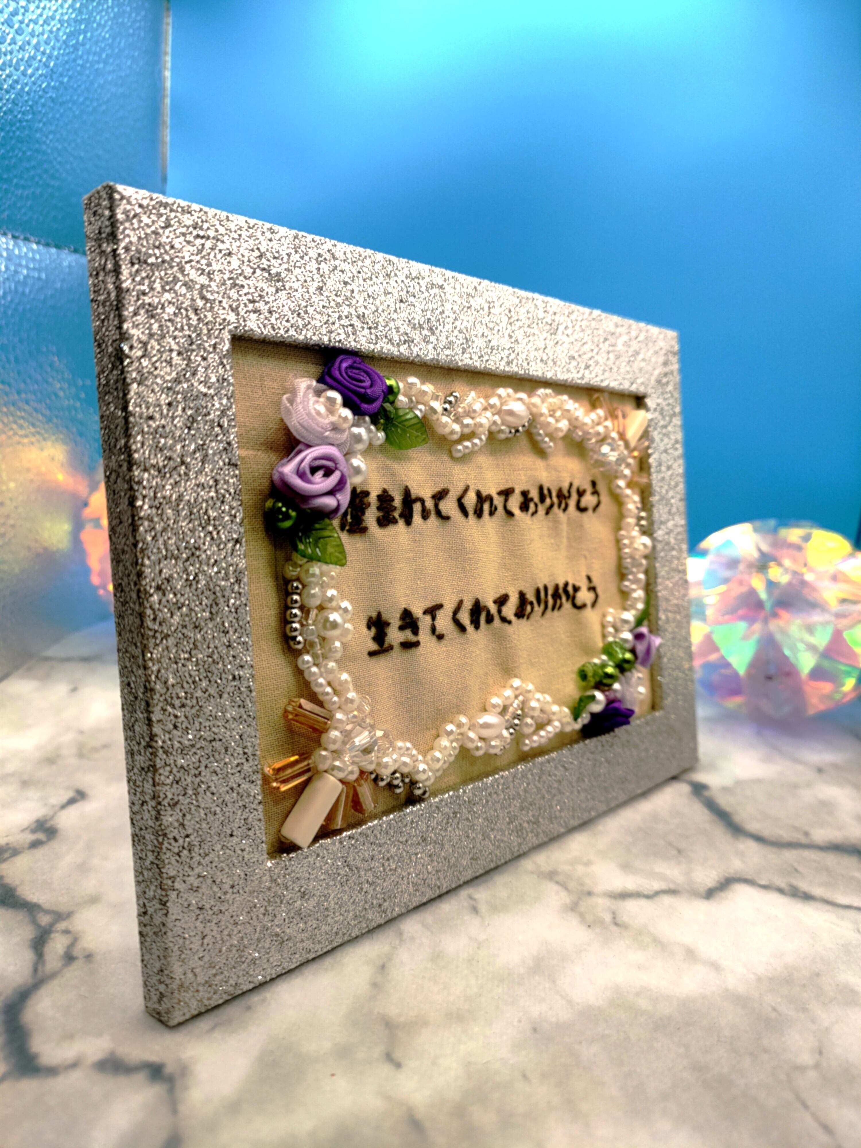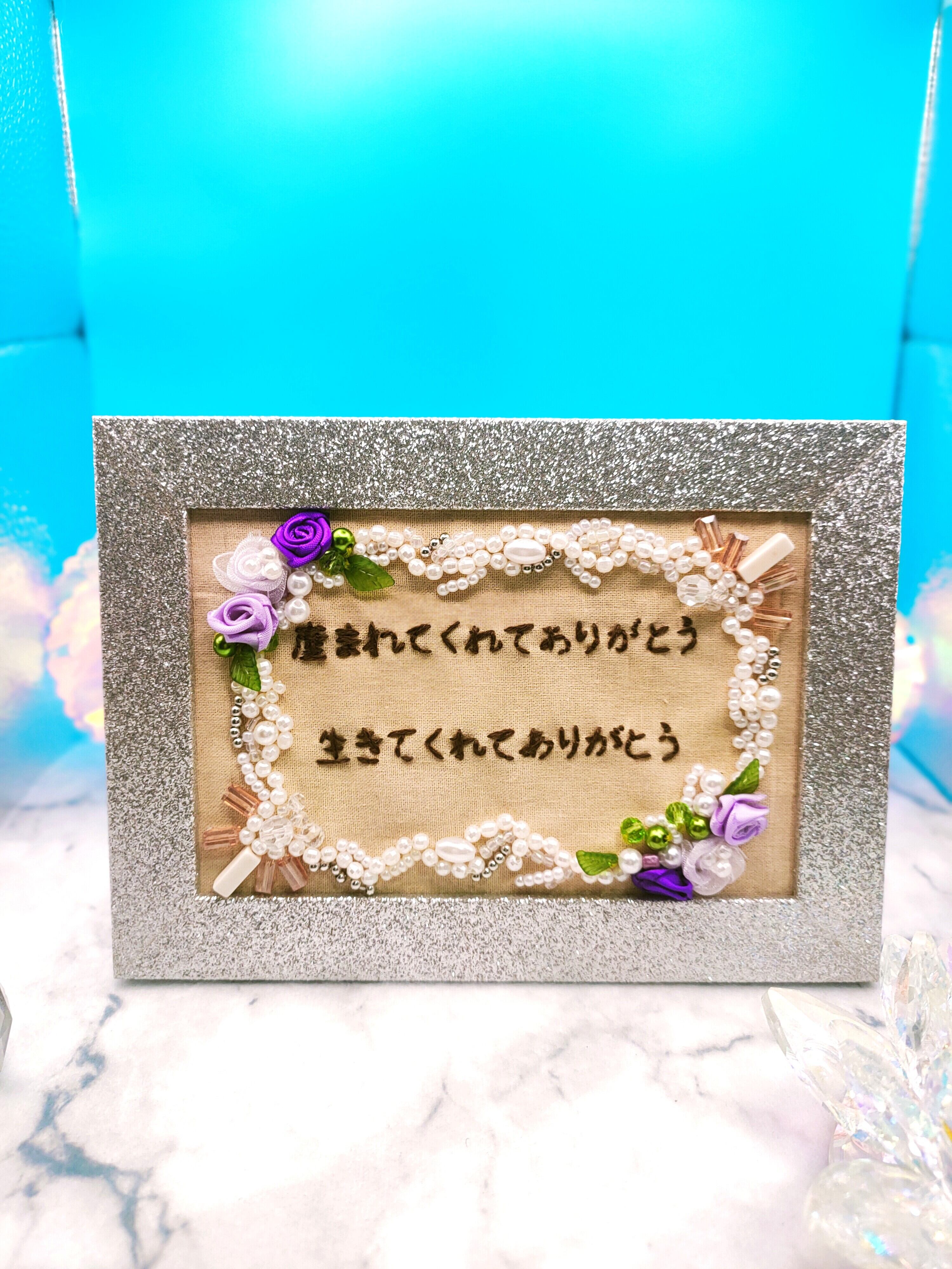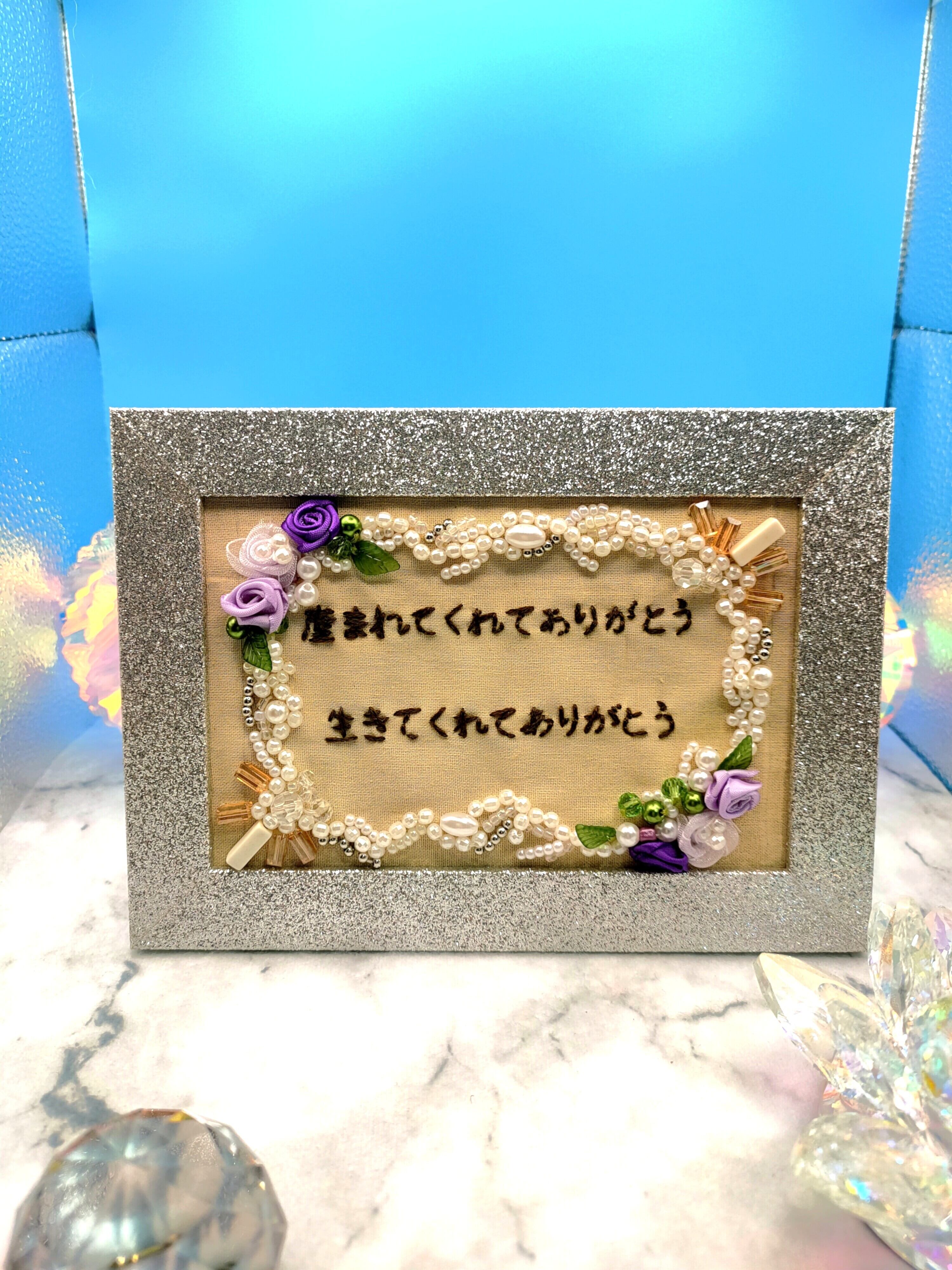 ある朝、夢の中で授かった言葉を横書きの刺繍に認めた一点物のアートフレームです。 「産まれてくれてありがとう 生きてくれてありがとう」
