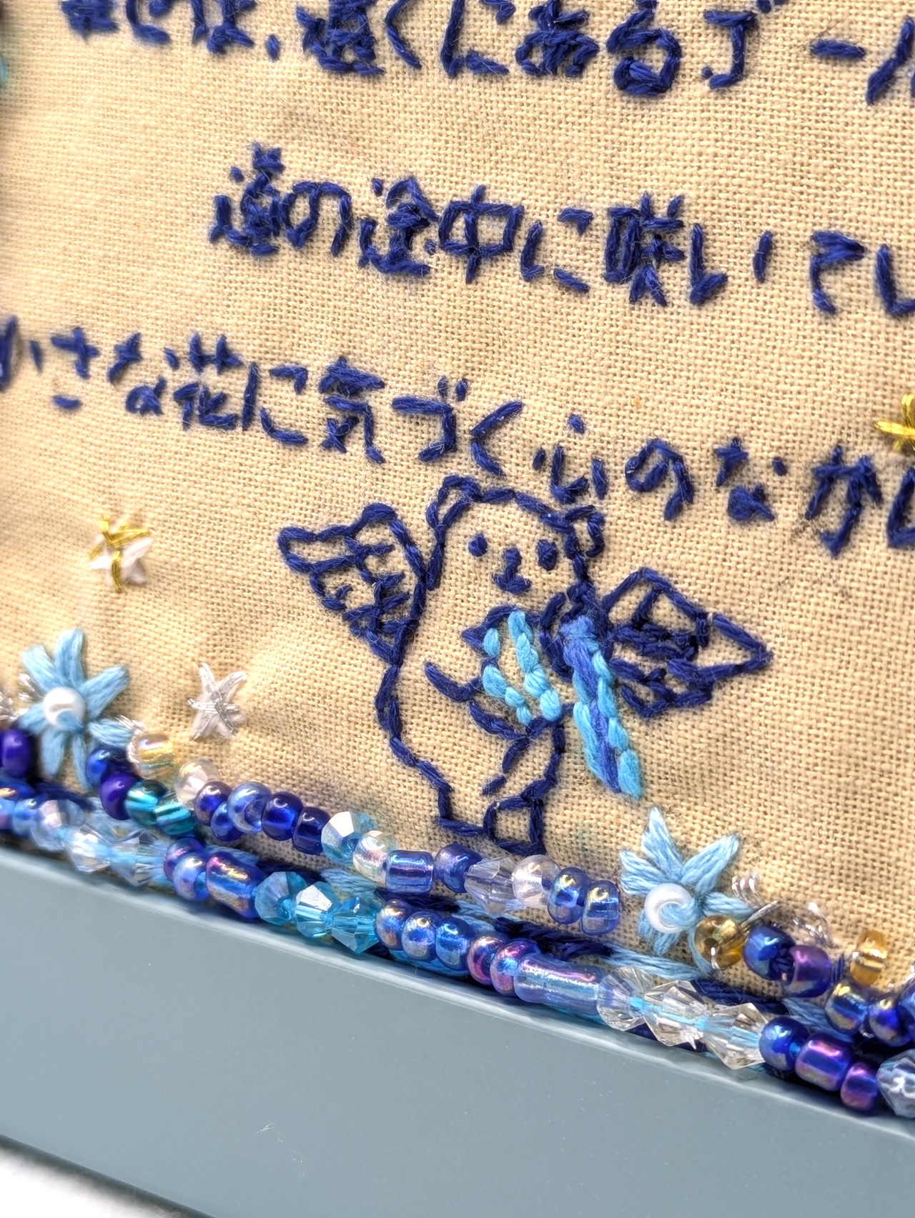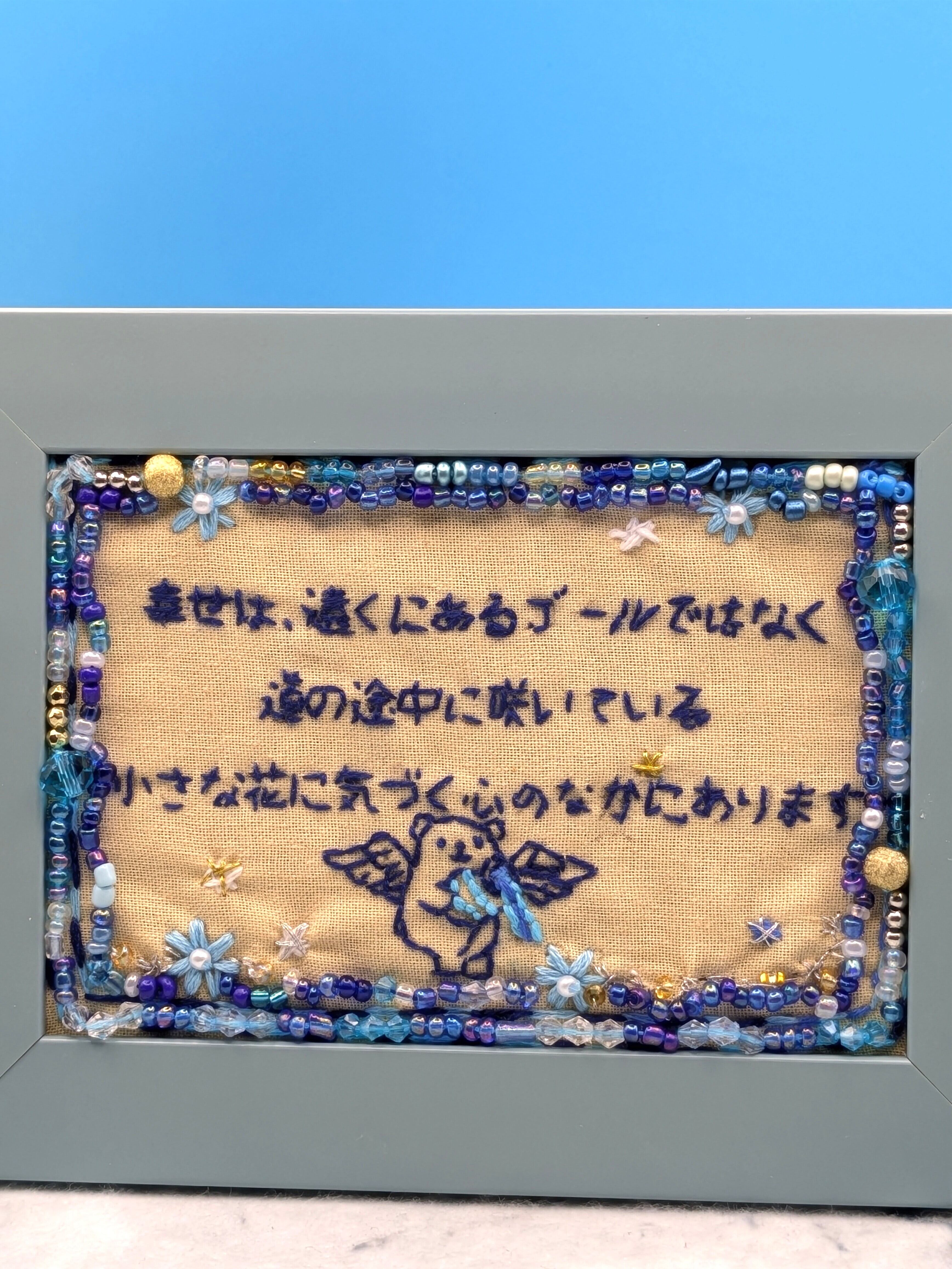 この言葉をコンセプトに、ブルーを基調とした繊細な刺繍を施しました。 中央には、みずがめ座のモチーフを抱いたクマの天使を配置し、周囲を多彩なビーズと花の刺繍で彩っています。