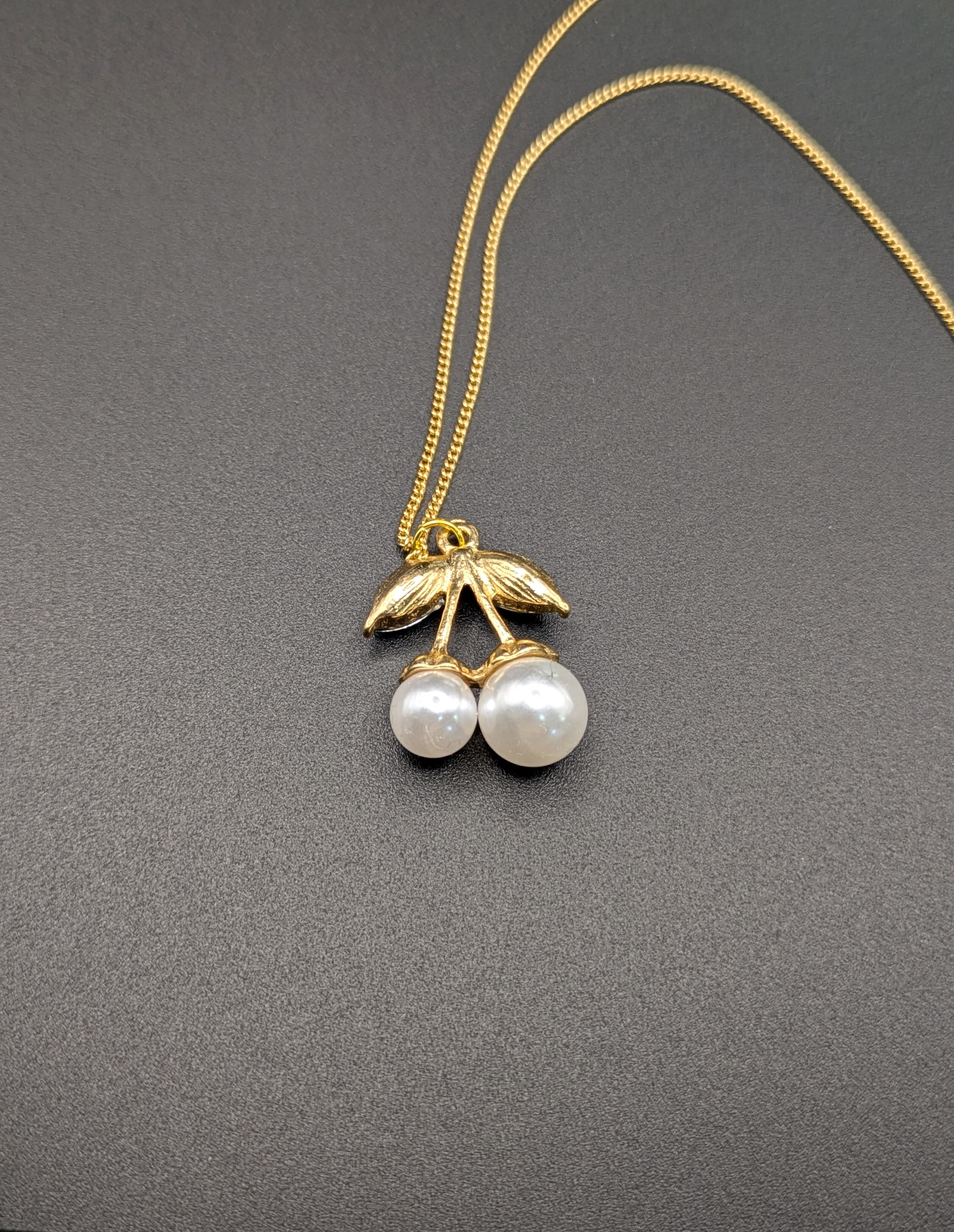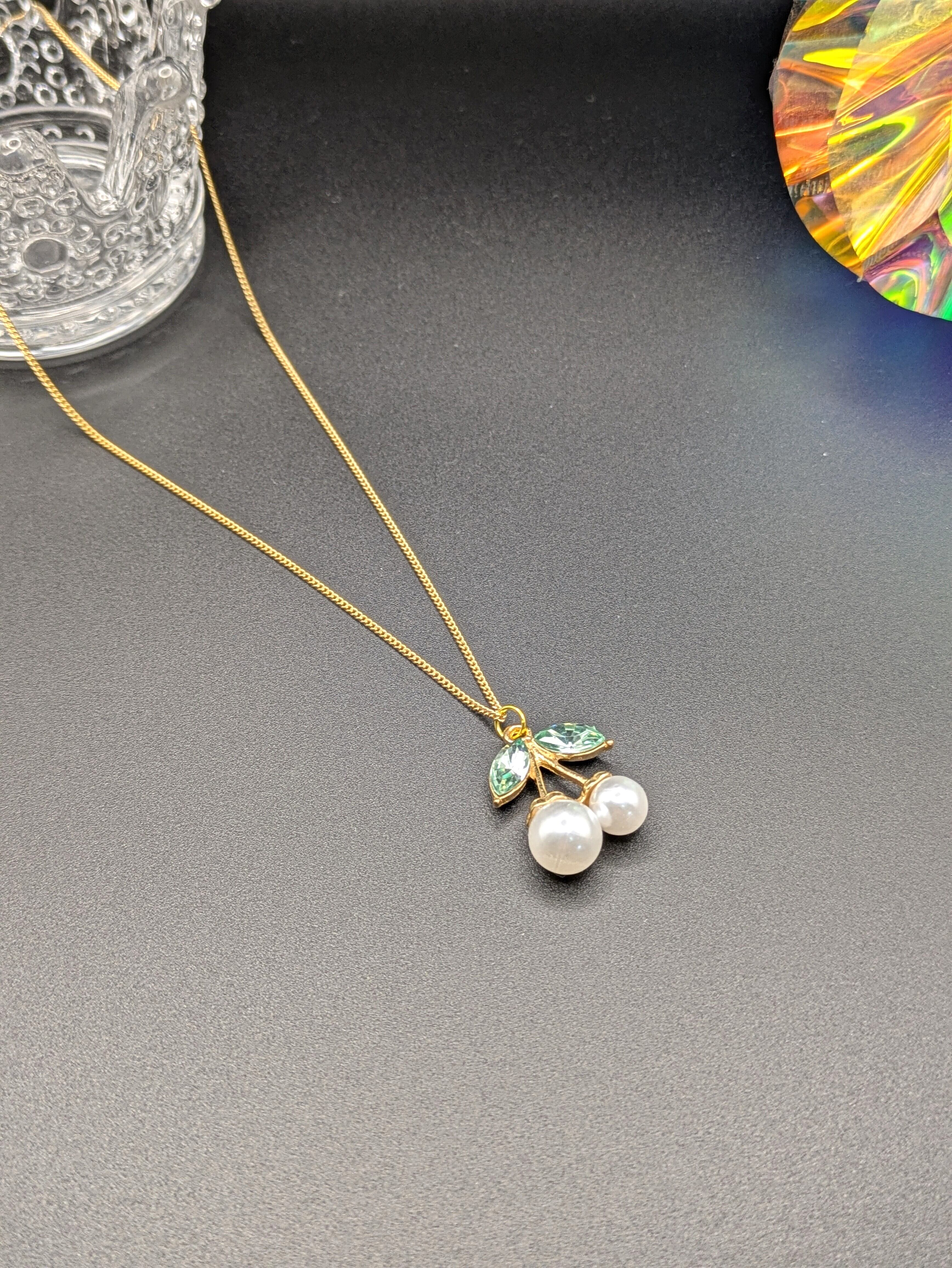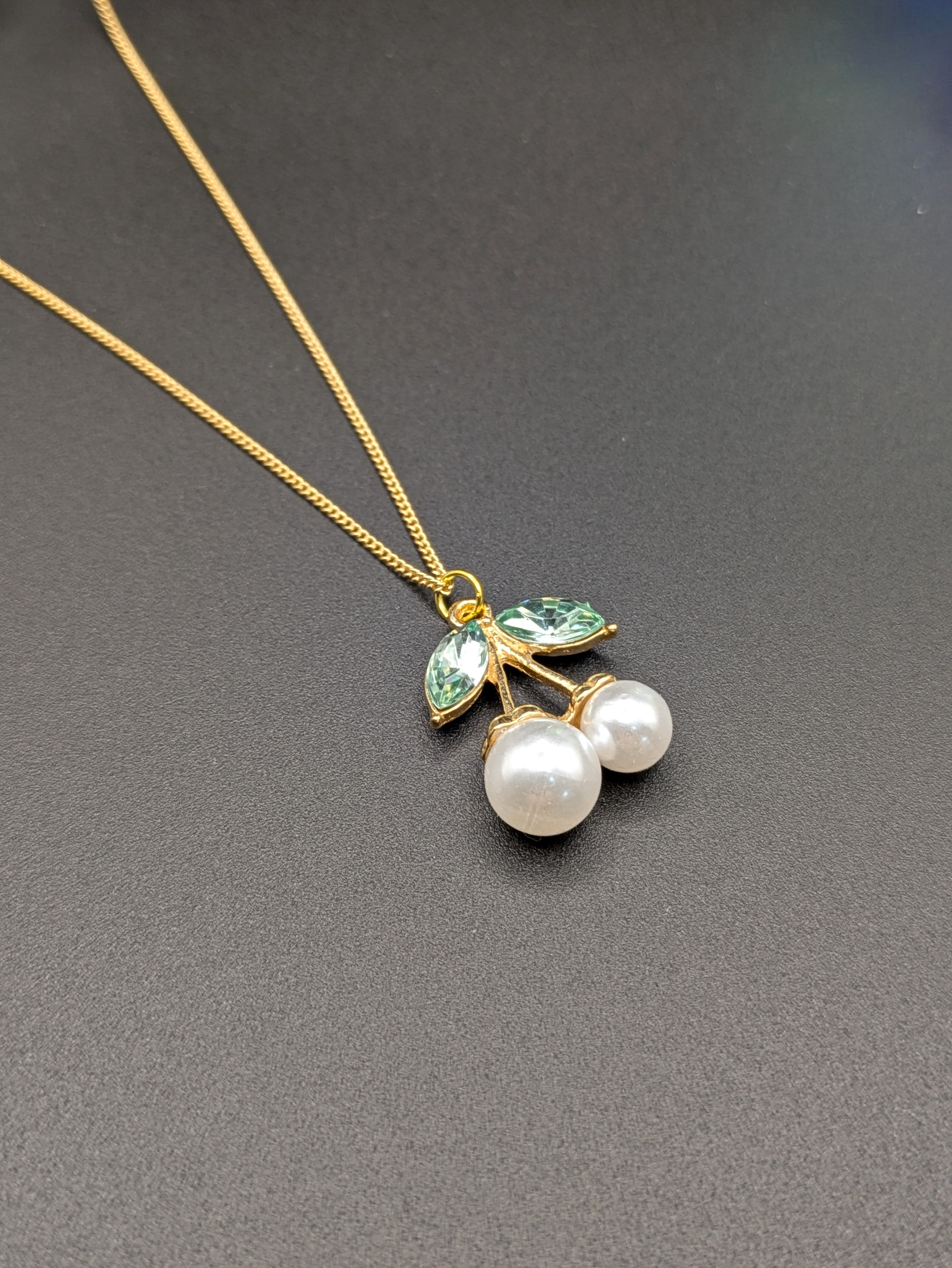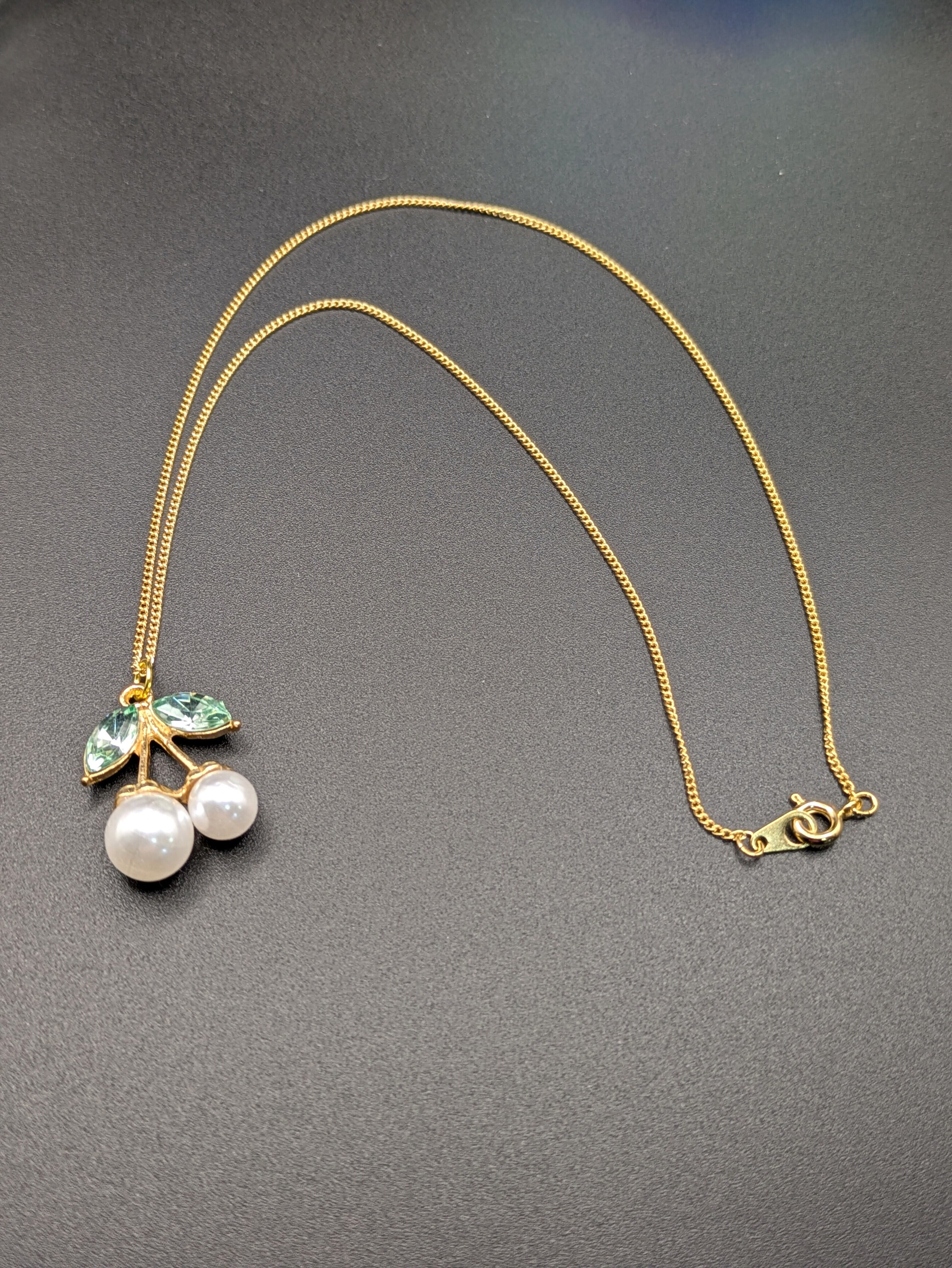 パールの艶やかさと、若葉のようなグリーンストーンが胸元を彩るチェリーモチーフのネックレスです。 派手すぎないゴールドチェーンを採用し、大人の女性でも使いやすい上品なデザインに仕上げました。