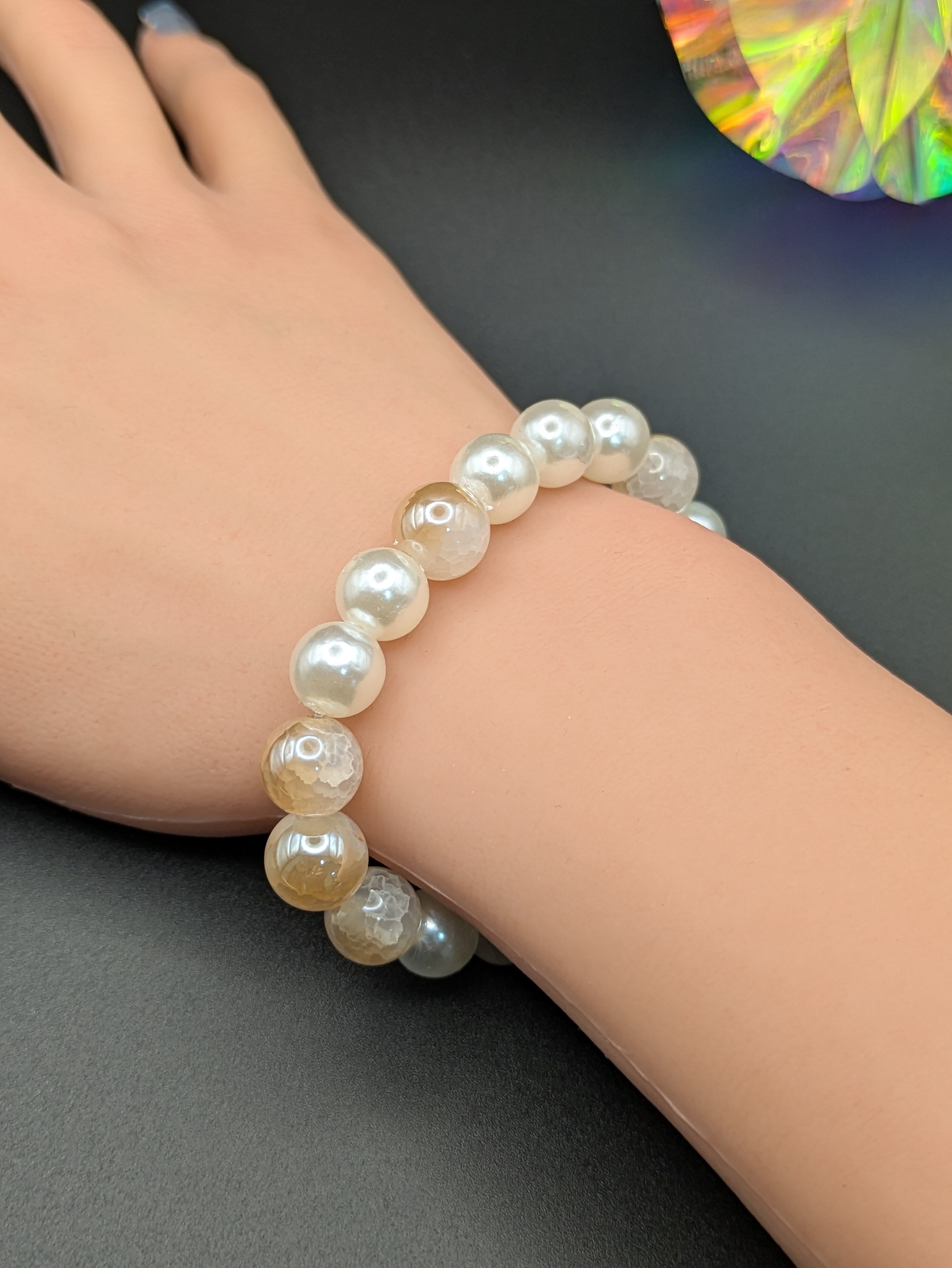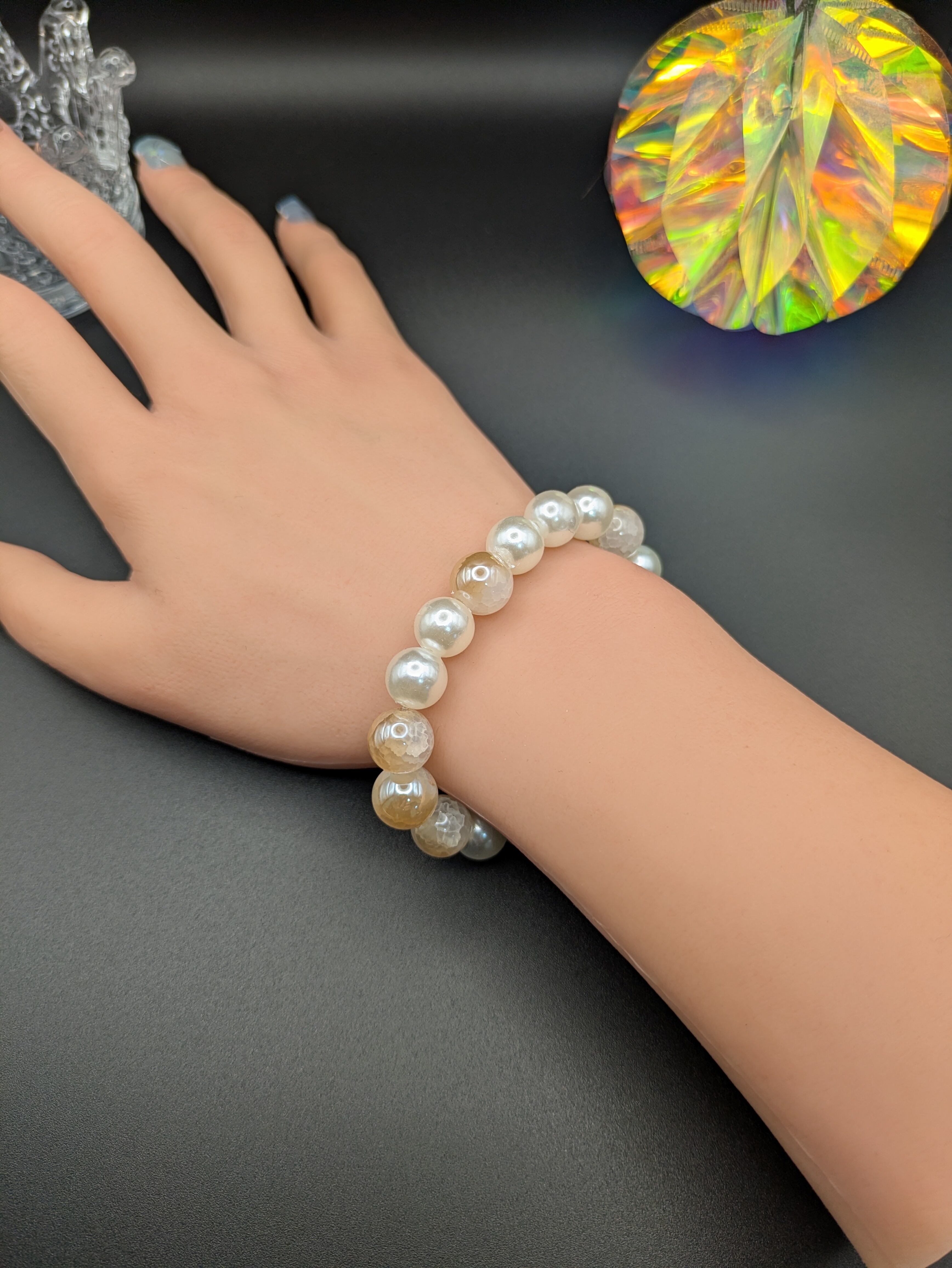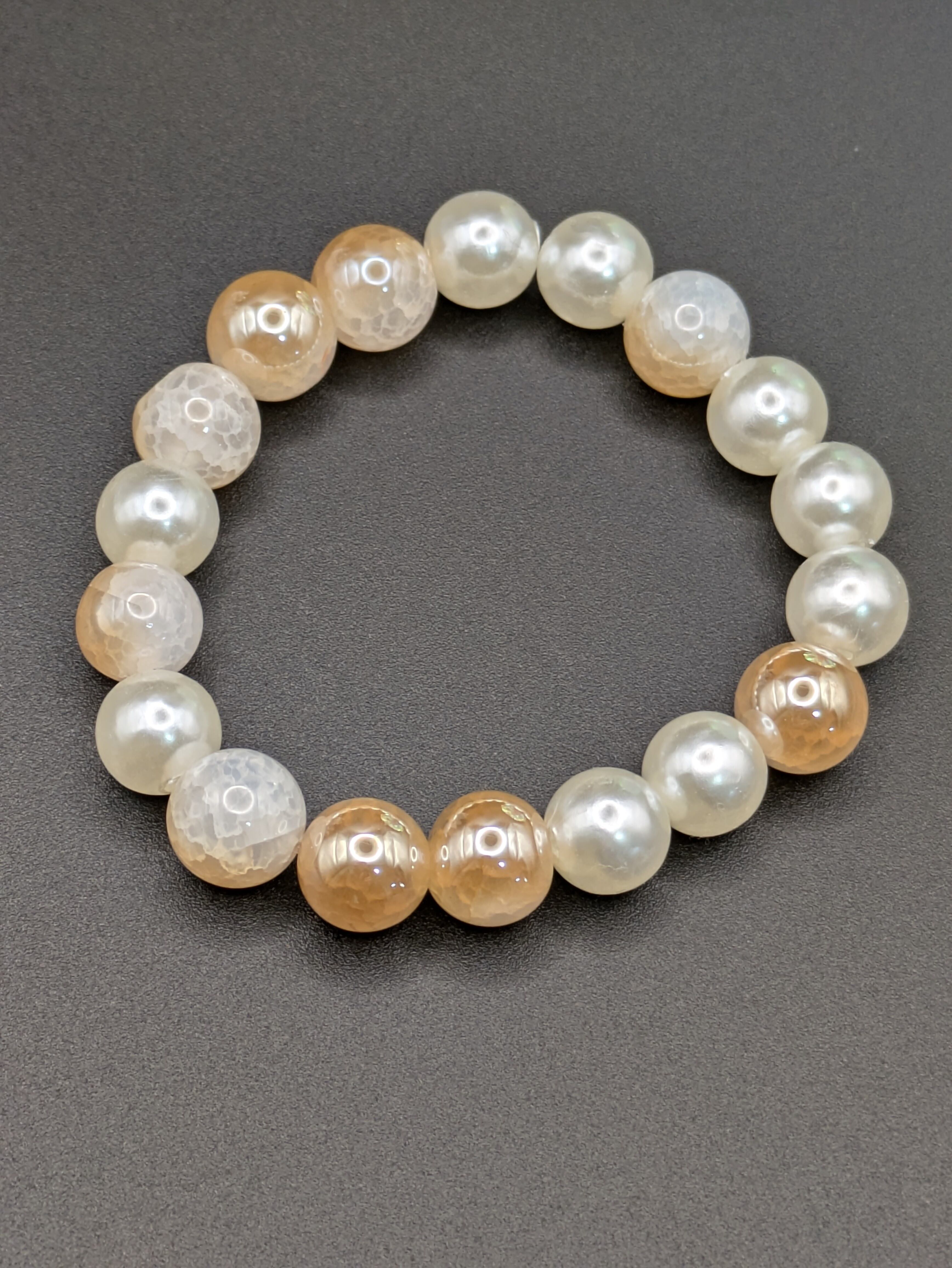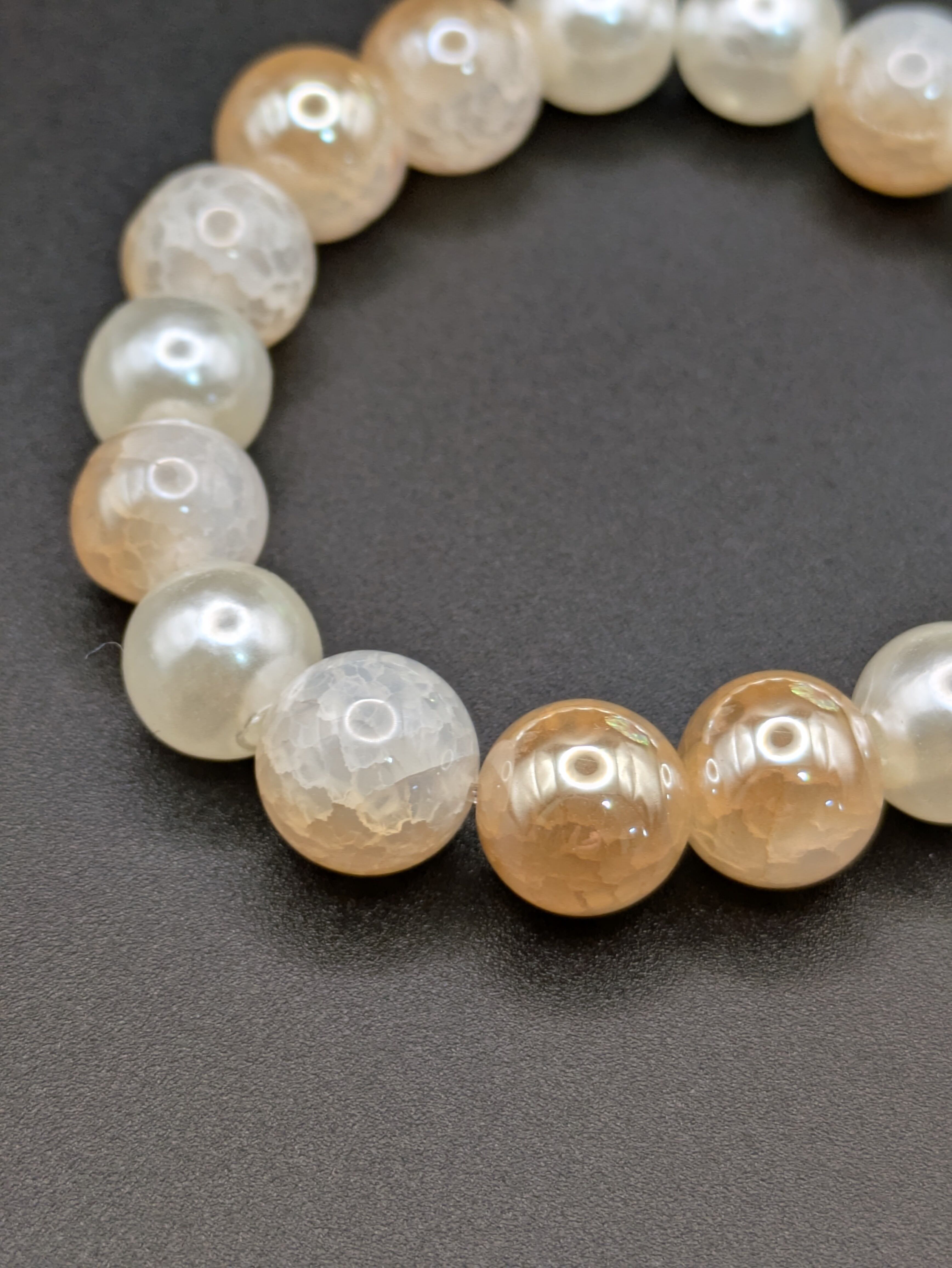 上品な輝きを放つシャンパンゴールドのクラッシュ天然石と、柔らかな光沢のアクリルパールを組み合わせたハンドメイドブレスレットです。