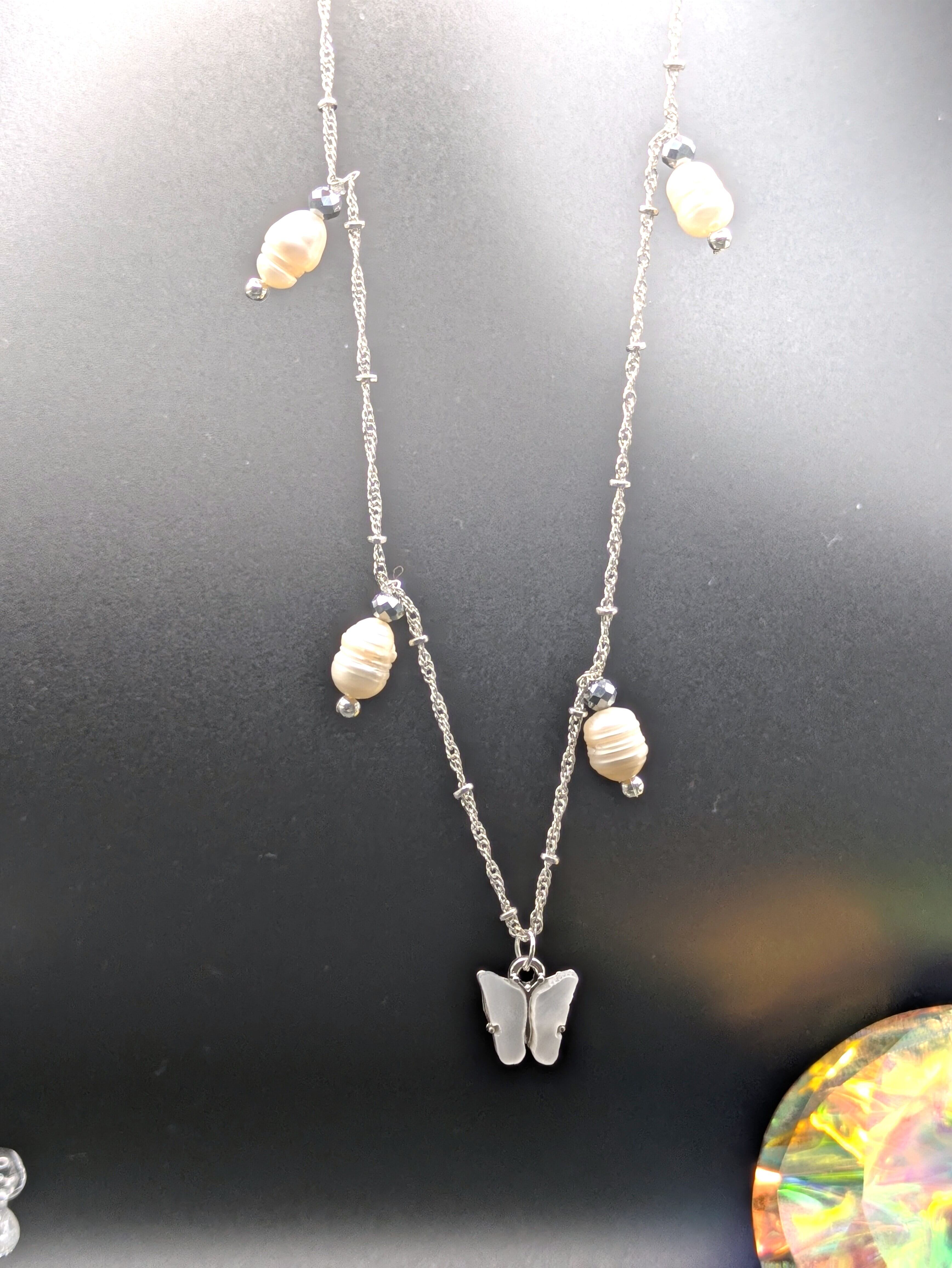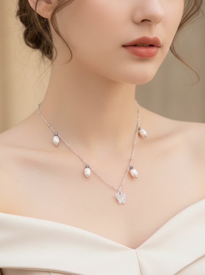 7-8mmサイズの淡水パールは、天然素材ならではの柔らかな輝きが魅力。等間隔ではなくあえてランダムに配置することで、首元に動きを出し、お顔周りをパッと明るく華やかに見せてくれます。 シルバーのクリスタルカットビーズが光を反射し、さりげない煌めきをプラス。中央で揺れるバタフライチャームが、大人の女性の可愛らしさを引き立てます。