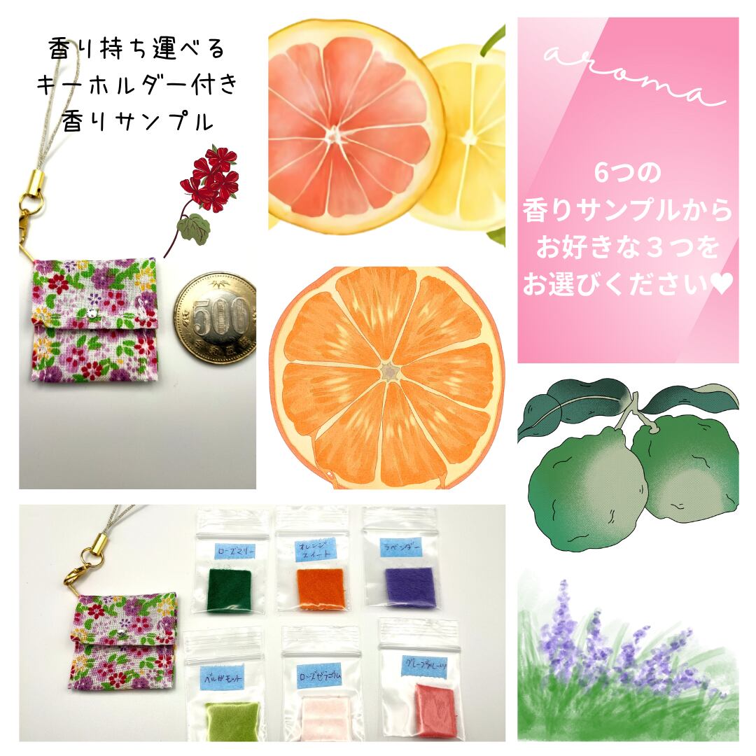 本商品は「香りを持ち運べるキーホルダー」や、各種アロマ雑貨に使用している香りを事前にお試しいただけるセットです。